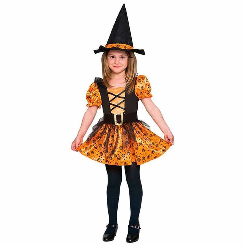 Fato Bruxa Laranja Menina para menina ao melhor preço, o disfarce é composto por Vestido, cinto com sobre Saia e boné para tamanhos: 4-12 Anos encontre em nossa loja o fato que você está procurando temos mais de 8000 fatos de Carnaval, Halloween e disfarces para Festas, descubra-os.