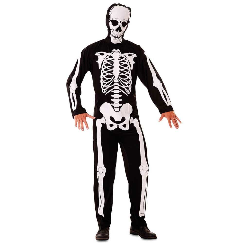 Os disfarces de Halloween para adulto vestem-se de ossos O fato de esqueleto para homem é perfeito para semear o pânico. Disfarces de terror para adultos para festas temáticas ou Halloween. O fato composto por um macacão com capuz com cara de caveira ocultará a tua identidade para torná-lo mais aterrador.