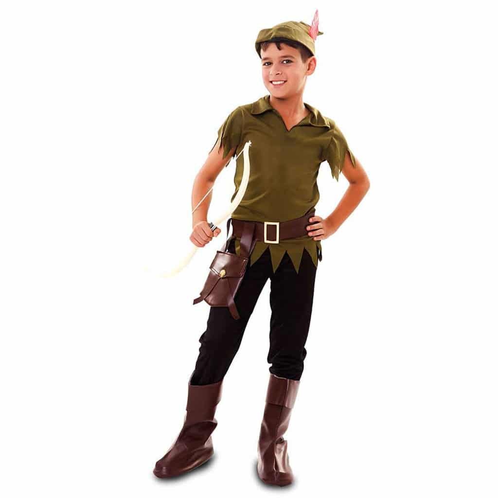 Fato de Robin dos Bosques para menino que incluí as calças pretas, a camiseta verde como o gorro, cinto com bolsa e cobre botas de cor castanha. Um completo fato de arqueiro ideal para representações e espectáculos. O fato de príncipe dos ladrões com o qual estarás estupendo no Carnaval ou em qualquer festa de máscaras. O ladrão dos bosques diverte-se!