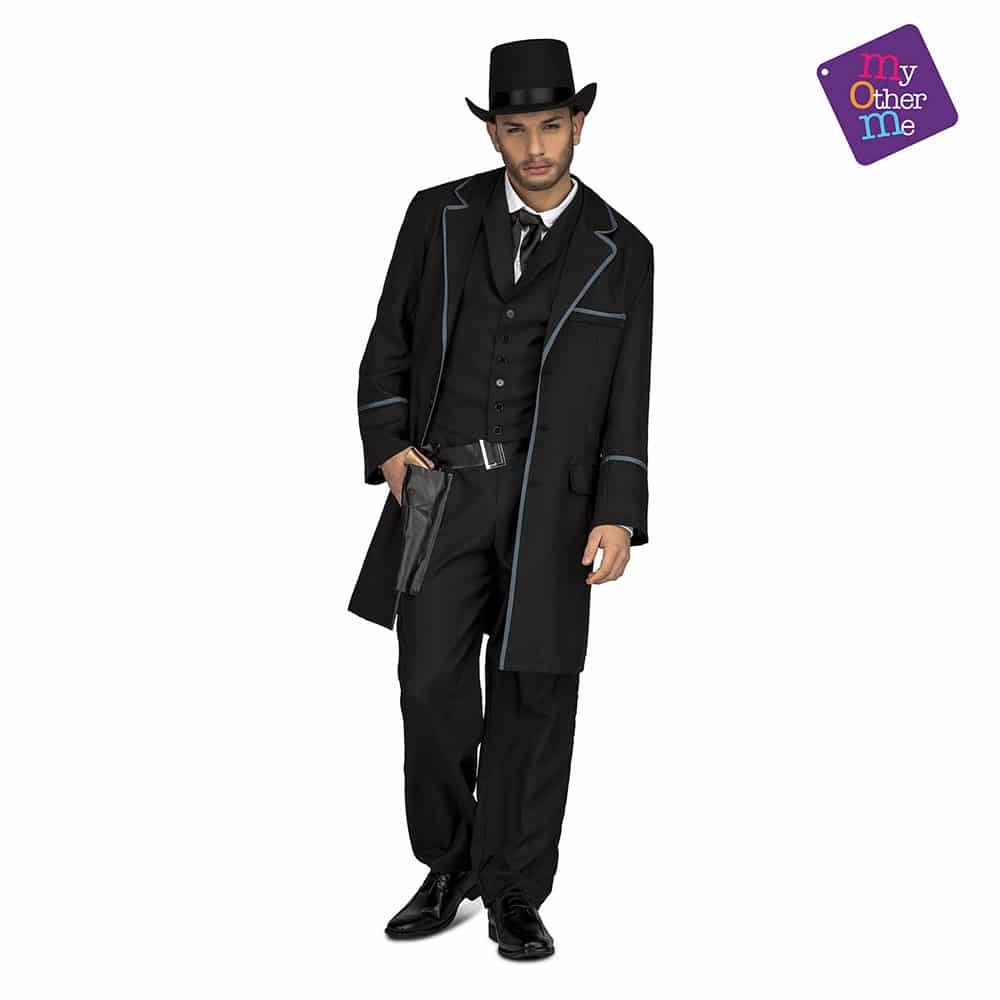 Contém: Casaco, colete, calças, gravata e cinto com coldre