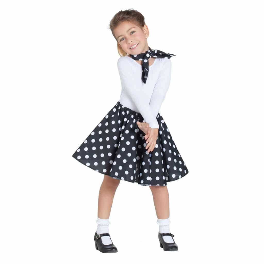 Os disfarces para menina estão cada vez mais bonitos. Observa o disfarce anos 60 infantil composto por uma saia com saiote e um lenço. Um disfarce barato para menina com um estilo vintage precioso. Desfruta do Carnaval com o disfarce retro com o qual te assemelharás a uma autêntica boneca.